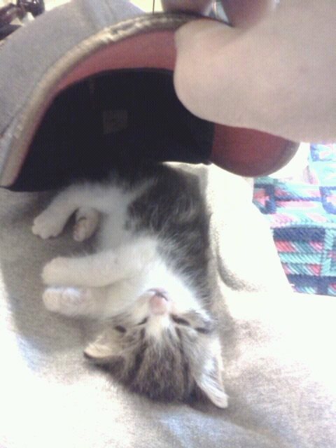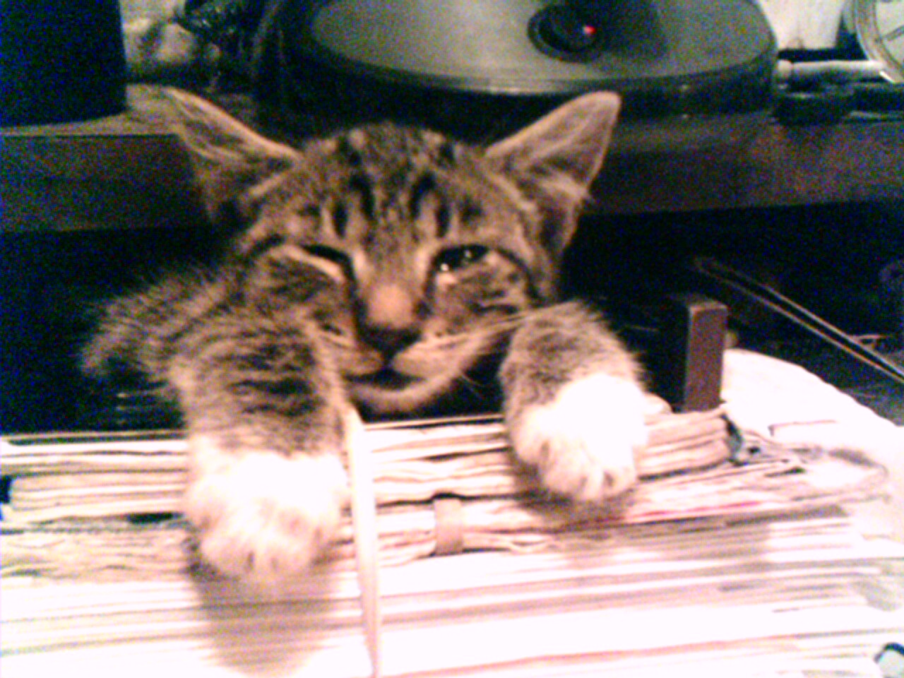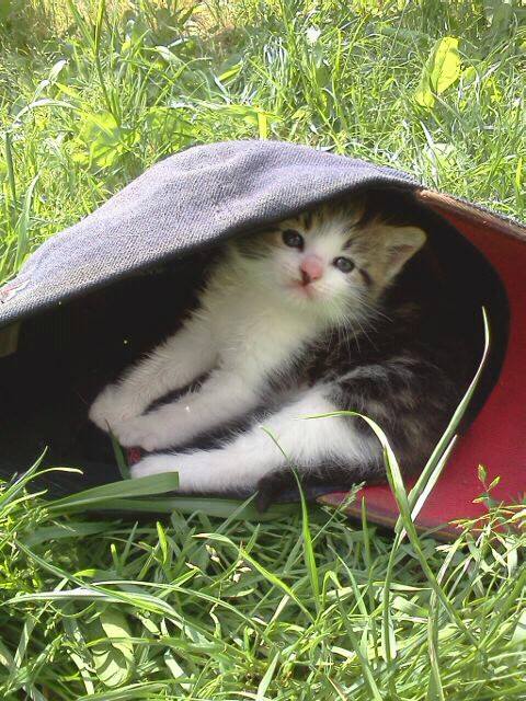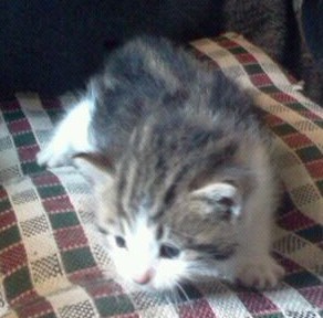 Mike was walking to town to do some shopping, and while crossing the bridge, he heard a kitten meowing frantically down by the river bank. After shopping, Mike crossed the bridge to go home, and heard the kitten crying out even louder. Being a lover of animals, Mike simply could not bear to leave a kitten in distress. He went down to the river bank under the bridge, called out to the kitten, and it came running out of the blackberries. After looking around for the kittens’ mother and not finder her, or any other kittens, Mike brought the kitten home, it was very hungry.